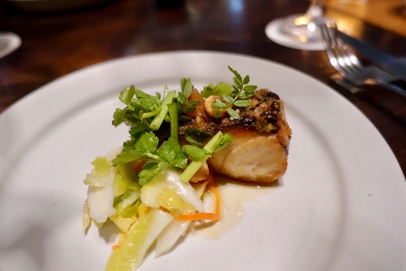 皮はパリッと、中はしっとりと火入れが絶妙なので美味しく頂けました。この後に頂いたお肉の火入れ加減は正直ちょっと我々にはレアすぎましたが、お魚の方は良かったですw