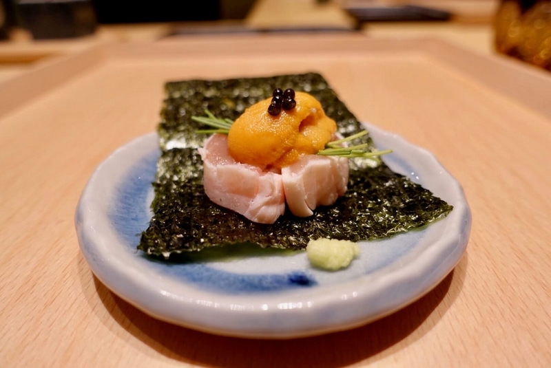レア目に火入れされた、たたきは昆布締めされてるとのこと。雲丹の鮮度も抜群で、ちょこんと載ってるキャビアも合わせるとなんともたまらない美味しさ。