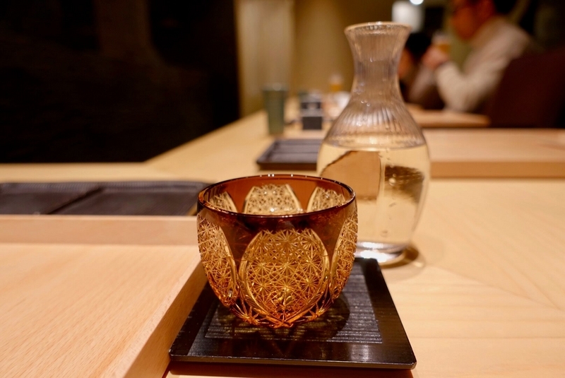 地下に降りてお店の扉を開けると、入口付近に切子グラスのディスプレイが圧巻でした。ワイン飲む気満々でしたが、急遽日本酒に変更。